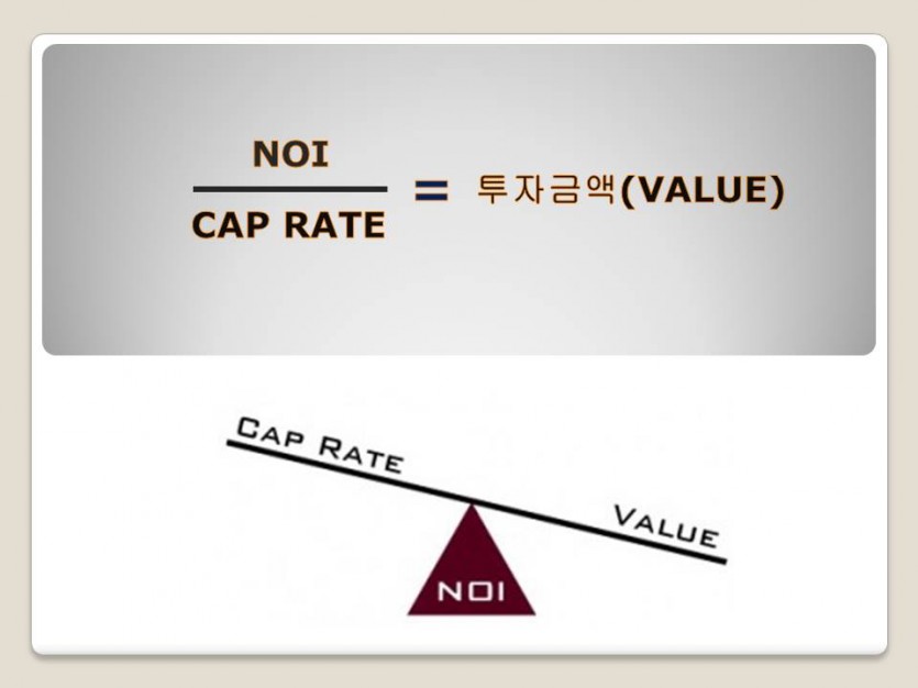 이처럼 내가 실제로 부동산으로부터 벌어들이는 돈과 이에 투자한 비용과의 비율을 따져 봄으로써 내 투자 수익률이 얼마나 되는 지 간접적으로 가늠해 볼 수 있는 지표가 바로 Capitalization Rate(줄여서 Cap Rate)인데, Cap Rate은 NOI를 매입가격으로 나눠주면 된다.