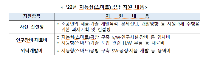 지능형(스마트)공방 구축에 따른 연구시설, 기계장비 및 부품 등 장비·재료비와 공정개선, 생산관리 및 제품개발, 지능형(스마트) 공방 구축 소프트웨어(SW) 연구·개발에 소요되는 비용을 업체당 최대 4천 9백만원까지 지원한다.