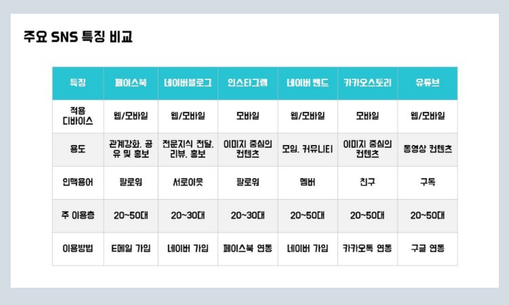 20대는 인스타그램,페이스북 30~50대는 카카오스토리,밴드 사용자가 많으며 소비자 연령층 세분화 채널선택 필요