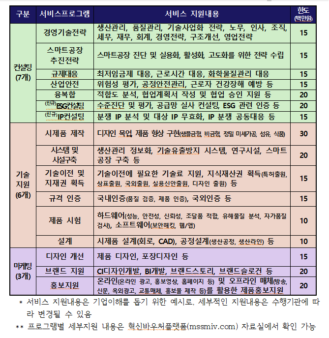 □ 사업내용 : 성장 가능성이 높은 중소기업을 대상으로 수행기관이 제공하는 분야별 서비스(컨설팅, 기술지원, 마케팅)를 이용할 수 있도록 바우처* 형태로 제공(기업별 50백만원 이내**)