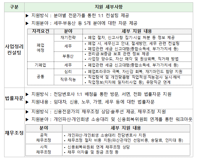 지원내용은 '사업정리컨설팅+점포철거지원+법률자문+채무조정’ 패키지