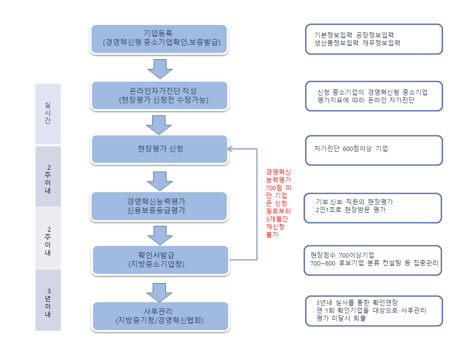 신청기업의 자가진단 실시결과 평가점수가 600점 이상인 경우에 한하여 메인비즈로 선정하여 줄 것을 신청을 할 수 있으며, 중소기업청장은 평가기관의 평가결과, 700점 이상인 기업에 대하여 메인비즈로 선정하게 된다.