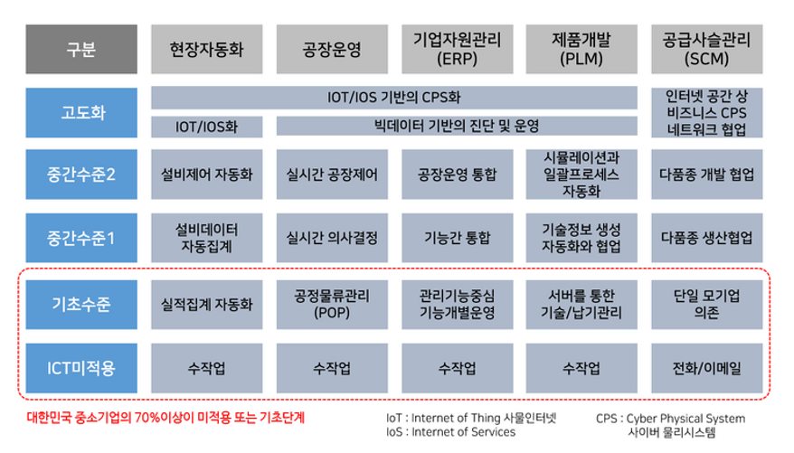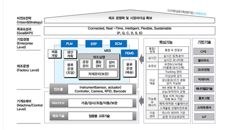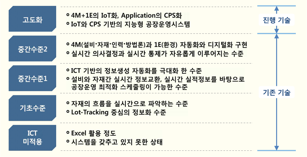 스마트공장은 ICT, 설비 및 자동화 솔루션이 융합되어 시장과 괙이 요구하는 스마트제품을 적시에 생산하여 적시에 납품 할 수 있도록 실시간 의사결정과 운영체계가 최적화된 인공지능형 공장을 의미한다